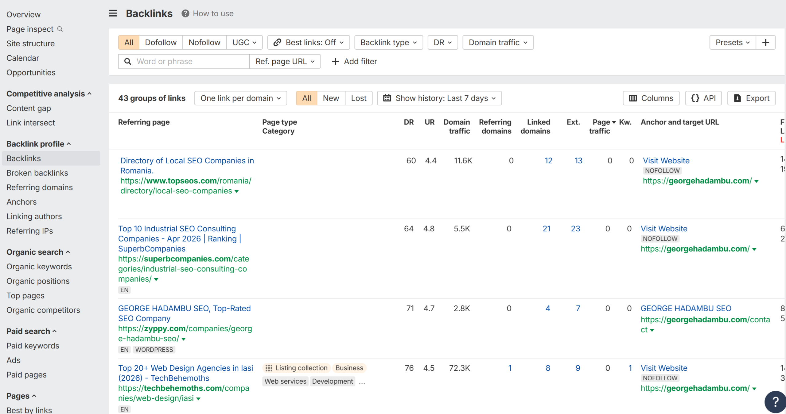 Audit detaliat al profilului tău de backlink-uri, analiză competiție și identificare oportunități disponibile.